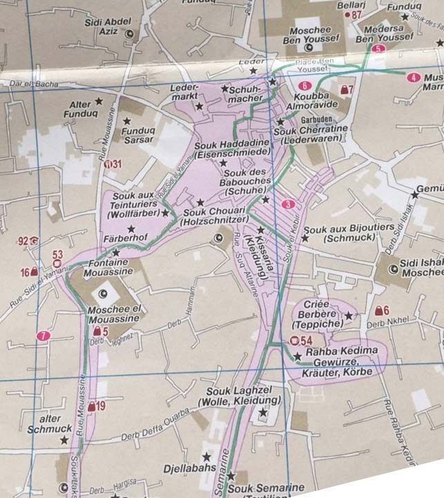 Hier ist eine Karte der Souks mit Handwerker Vierteln…ob Euch das was in der Praxis bringt, bezweifele ich aber…wenn man einmal im Getümmel drin ist…weiß man sowieso nicht mehr wo man ist….also einfach treiben lassen …